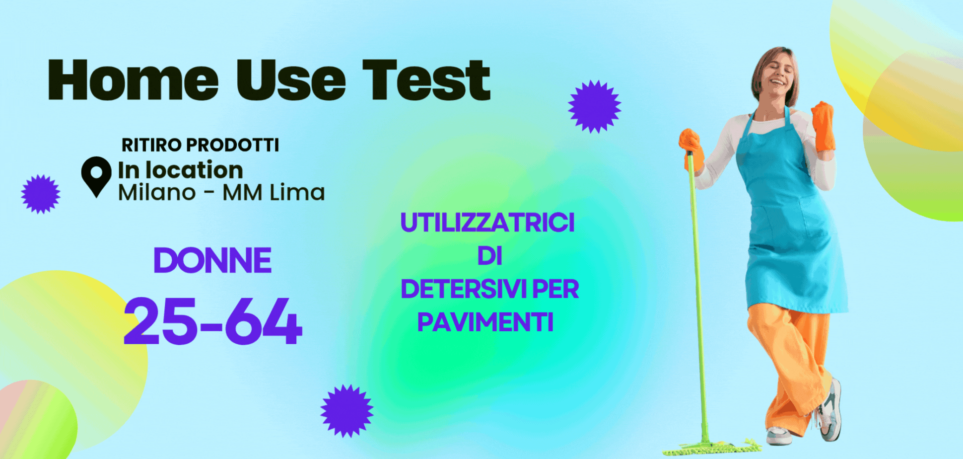 Donne 25-64 anni utilizzatrici di detersivi per pavimenti Quando 28/10/2025 - 28/10/2025 10:00 - 19:30 Target Donna 25 - 64 anni Durata 1 questionario online circa 20 minuti Dove Spazio Lima (Piano T.) Piazza Lima, 3, M I L A N O, MI, 20124, Lombardia Omaggio 10 euro in Buoni IdeaShopping Omaggio caricato sul Profilo entro il 18/11 sera Descrizione TEST con 1 PRODOTTO da provare a CASA DONNE 25-64 ANNI UTILIZZATRICI DI DETERSIVI PER PAVIMENTI RITIRO PRODOTTO : martedì 28 OTTOBRE (dalle 10:00 alle 19:30) presso Spazio Lima Piazza Lima, 3 – Milano (piano terra) Candidatura Per candidarti a questa intervista, ACCEDI o REGISTRATI!